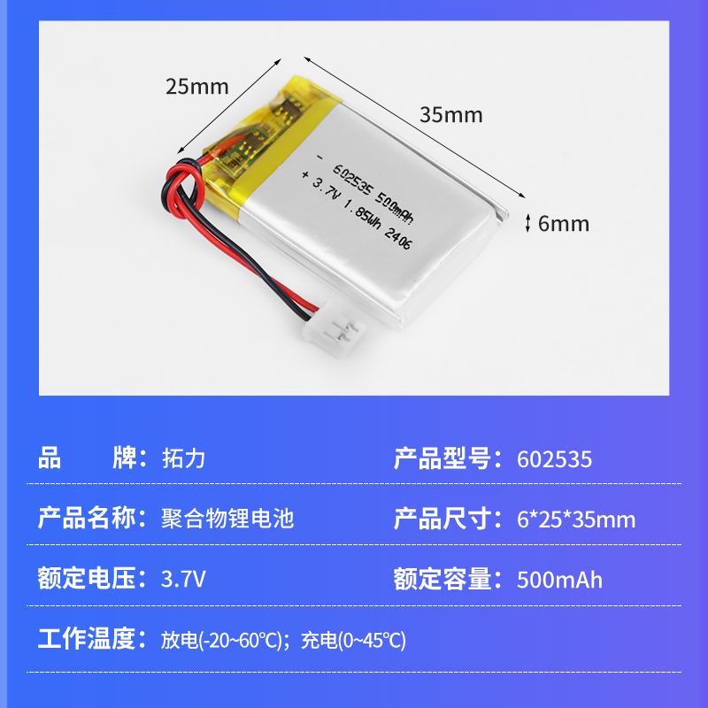 3.7V1800mah 103450 聚合物鋰電池東莞市拓力新能源科技有限公司成立于2017年,專業(yè)生產(chǎn)數(shù)碼電池、工業(yè)電池、動力電池,壁掛式儲能電池、鉛酸電池研發(fā)、太陽能模組、特種需求電池等電池相關(guān)產(chǎn)品