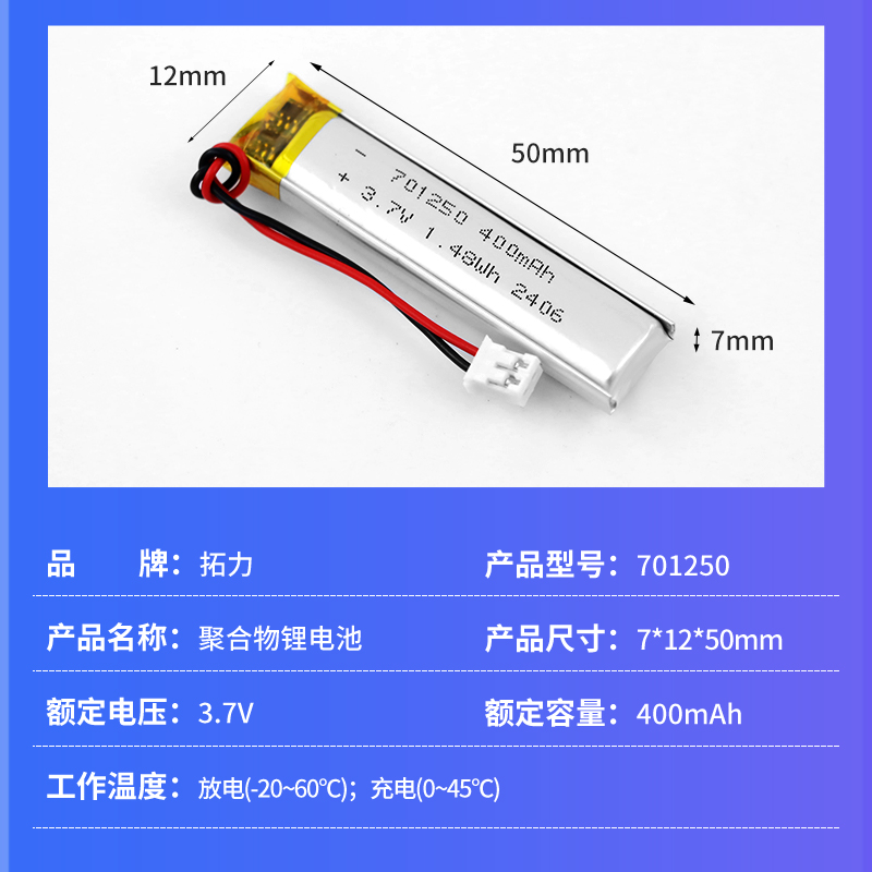 3.7V1800mah 103450 聚合物鋰電池東莞市拓力新能源科技有限公司成立于2017年,專(zhuān)業(yè)生產(chǎn)數(shù)碼電池、工業(yè)電池、動(dòng)力電池,壁掛式儲(chǔ)能電池、鉛酸電池研發(fā)、太陽(yáng)能模組、特種需求電池等電池相關(guān)產(chǎn)品