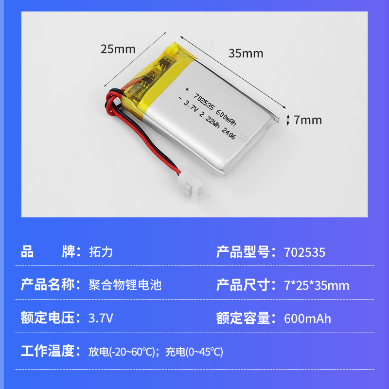 3.7V1800mah 103450 聚合物鋰電池東莞市拓力新能源科技有限公司成立于2017年,專業(yè)生產(chǎn)數(shù)碼電池、工業(yè)電池、動力電池,壁掛式儲能電池、鉛酸電池研發(fā)、太陽能模組、特種需求電池等電池相關(guān)產(chǎn)品