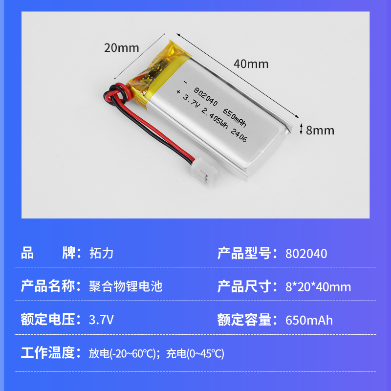 3.7V1800mah 103450 聚合物鋰電池東莞市拓力新能源科技有限公司成立于2017年,專業(yè)生產(chǎn)數(shù)碼電池、工業(yè)電池、動力電池,壁掛式儲能電池、鉛酸電池研發(fā)、太陽能模組、特種需求電池等電池相關(guān)產(chǎn)品