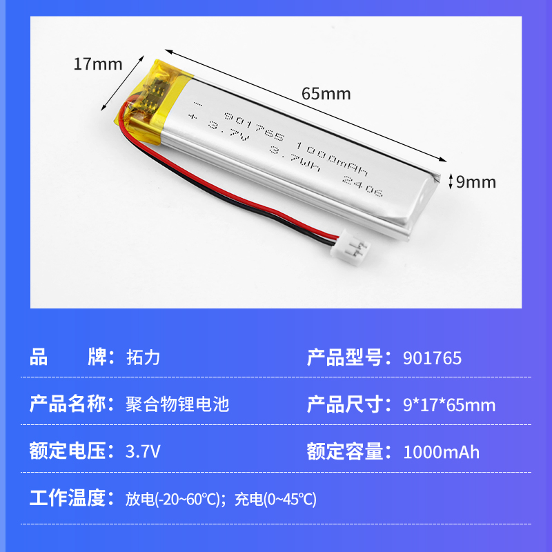3.7V1800mah 103450 聚合物鋰電池東莞市拓力新能源科技有限公司成立于2017年,專業(yè)生產(chǎn)數(shù)碼電池、工業(yè)電池、動(dòng)力電池,壁掛式儲(chǔ)能電池、鉛酸電池研發(fā)、太陽(yáng)能模組、特種需求電池等電池相關(guān)產(chǎn)品