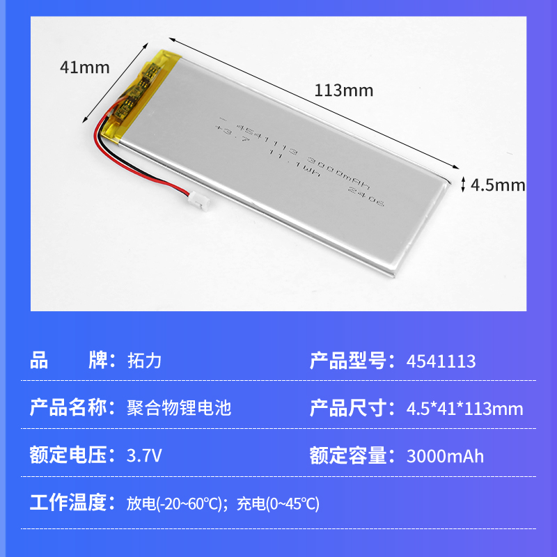 3.7V1800mah 103450 聚合物鋰電池東莞市拓力新能源科技有限公司成立于2017年,專業(yè)生產(chǎn)數(shù)碼電池、工業(yè)電池、動(dòng)力電池,壁掛式儲(chǔ)能電池、鉛酸電池研發(fā)、太陽能模組、特種需求電池等電池相關(guān)產(chǎn)品